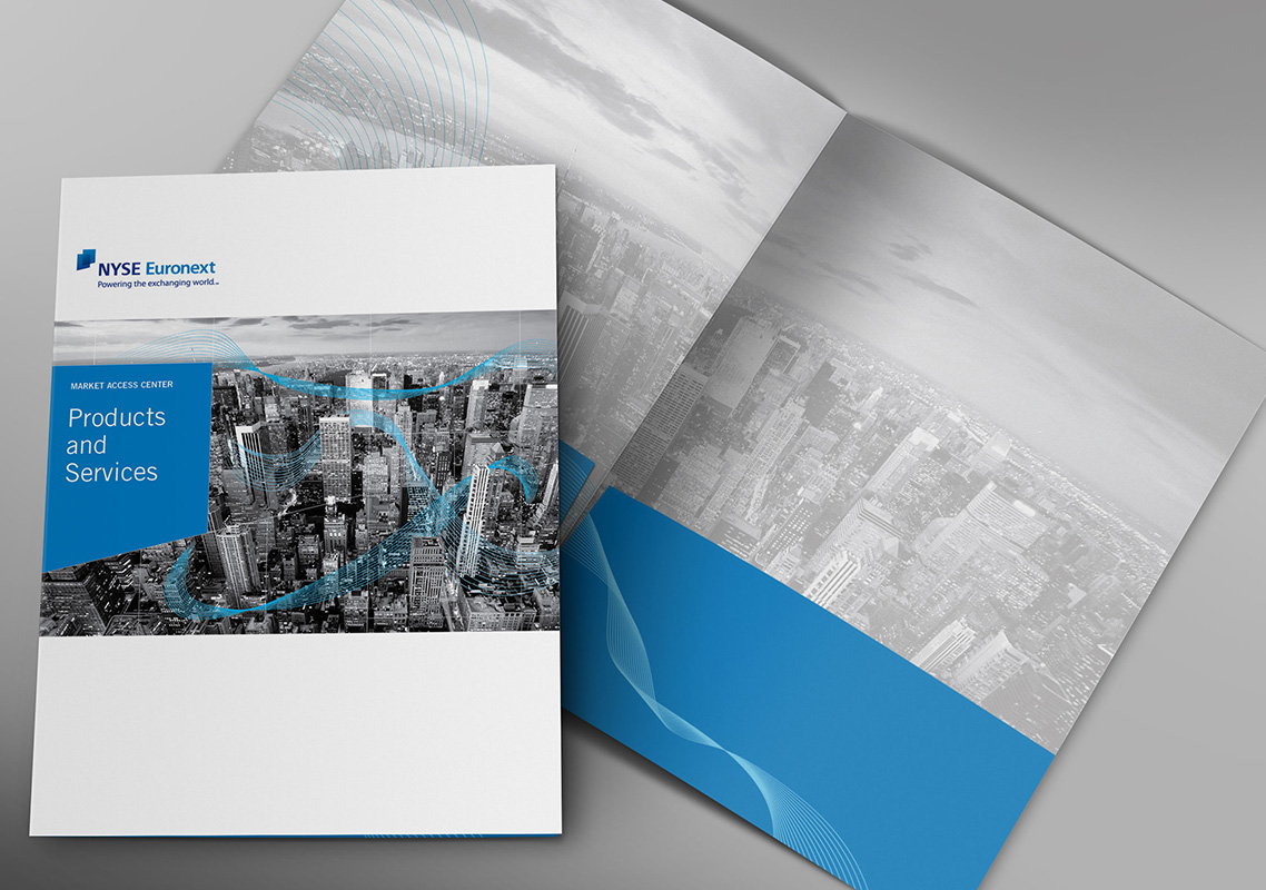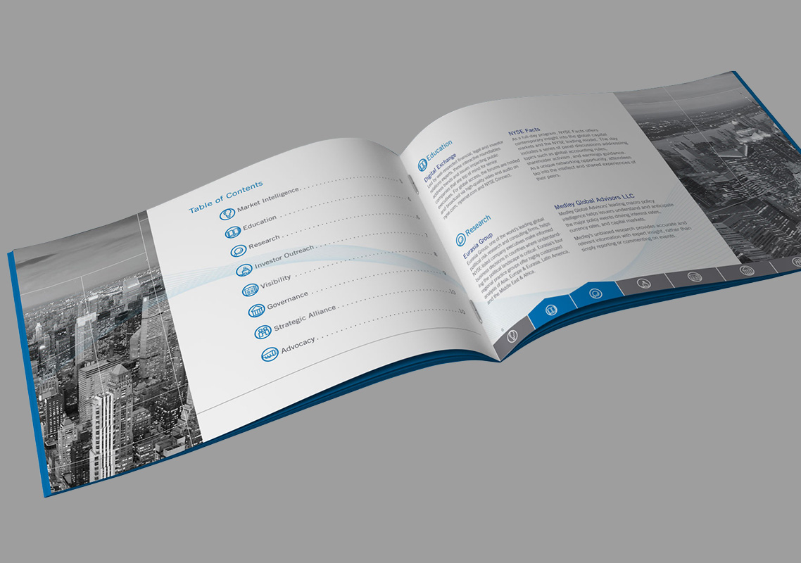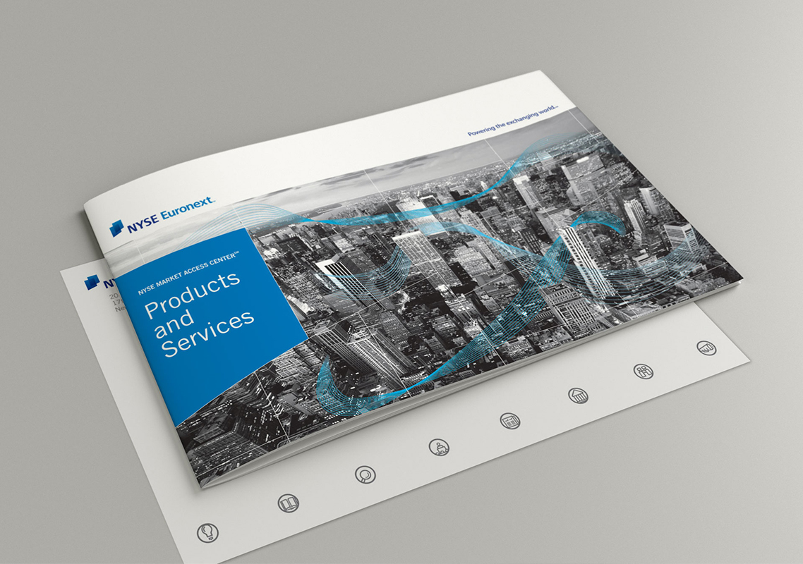 The NYSE's Market Access Center was redesigned and needed a new Internal Brand Launch. I worked with the Marketing team to give MAC a unique style within the NYSE Brand. We added black and white photos and blue vectors interacting with them. The lighter NYSE's secondary brand color was chosen as their main color to go along the black and white photos. I created icons that were used on the website and other publications.